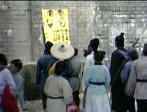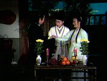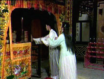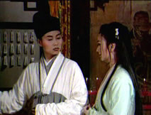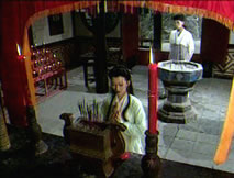 看見供桌上的籤筒,桂英興致勃勃,拿過籤筒,誠心祈求。站在她身後,仲平無奈地笑了笑,見她拾起籤竹,仲平殷勤湊上:「你向神佛問了些什麼問題?」桂英展顏不答,將籤竹遞給他,按著籤竹取下對應的籤文,他笑笑遞