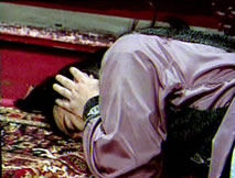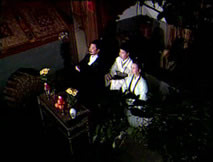 夜闌人靜,望著身旁仲平的靈位,桂英的心就像這深沉的夜色,灰暗而淒涼。受春香之托保護桂英的柱兒橫凳坐守在門外。專注於雕刻手中木像