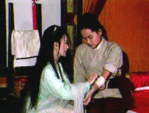 跳下床來,在披於椅背上的外袍中摸索一陣。眨眼間,「桂英,你看看!」他朝她攤開手掌,掌心中是一支非常精緻的髮簪。「我從來就沒有見過這樣精緻的款式!」桂英又驚又喜,看得愛不釋手。看著她,仲平深情輕訴:「這是我爹叫人訂做的傳家之寶,我們三兄弟各有一支;這是唯一一