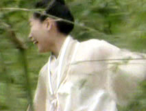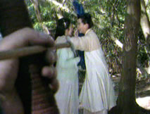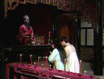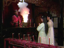 看到泥塑木雕的海神像,桂英異常歡喜:「這就是海神爺?!那樣子看起來好慈祥,栩栩如生,就像是我們自家的爺爺,難怪鍾大哥他要指引我們來請海神爺替我們做媒。」「那麼我們就稱它海神爺爺吧!」仲平拉著桂英為海神爺燃上清香,雙雙跪下:「海神爺爺,我們沒有大紅花轎,沒有花堂喜燭,我
