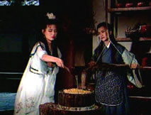 盡了,轉磨的雙手越推越慢。碧玉無聲無息的走進來,得意萬分的瞧著桂英:「你看你這樣子,哪裡像個秦淮花魁啊,真是早知如此,何必當初。」「當初決定跟相公相守一生,至今沒有半點悔意。如果人生還會重來一回,我還是會這樣做!我有相公給我的真心相許,再多的苦,我也心甘情願!」桂英甘之如飴的滿足神情讓碧玉又妒又恨。她冷笑著走到一桶桶磨好的豆漿面前,聲音充滿怨毒:「心甘情願!我就讓你心甘情願!」一腳踢翻桂英磨了一夜的豆漿,惱怒而去。伸手一下下捧起地上的豆漿,桂英淚流滿面,拿出袖中的髮簪,在