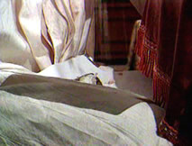 背對躲藏窗後的主僕二人,看似狼吞虎嚥,實際將飯菜全倒入紙中包住,丟在桌下。滿足的歎口氣,仲平裝出酒足飯飽的樣子,忽然,「哎喲,我的肚子好