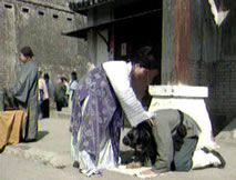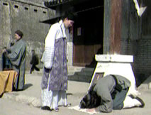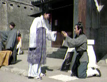 仲平與往日一般,在城中的大街小巷體察民情。一路巡視,竟看見傻大個小六子一身襤褸縮在街角,好奇走上前去,仲平溫聲詢問:「小六子,你怎麼了?」小六子忙向仲平拜倒,泣聲相訴:「王大人,草民母親剛剛過世,小民想賣身葬母,可都沒人理會,小六子如不能安葬母親,還像個人嗎?不如餓死
