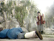 孤山之下渺無人煙,仲平步履不停,在荒郊路上急急而行。不遠處趴伏在地的一個男子讓仲平放慢了腳步,疑惑著走上前,剛要靠近時,「唰」的一聲,一把鋼刀在他胸前險險劃過,仲平敏捷閃開再揚弓揮去,擋住地上男子又一下致命的攻擊。刀來弓擋,幾個回合後,那男子不是仲平的對手,轉身欲