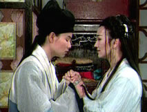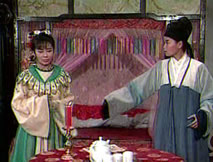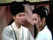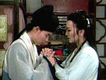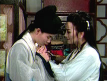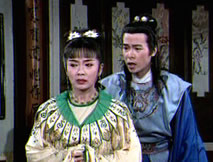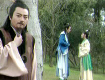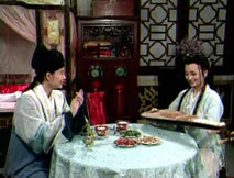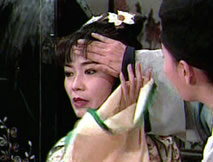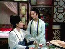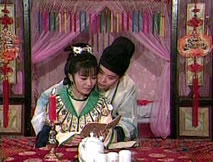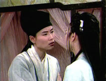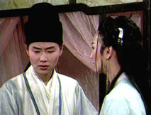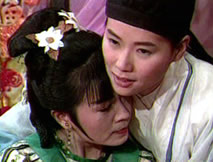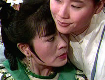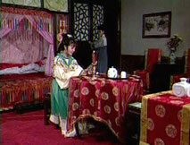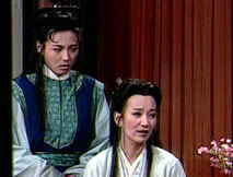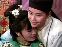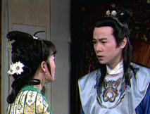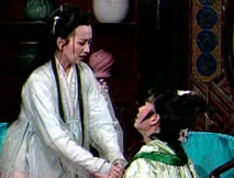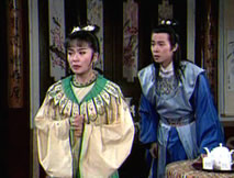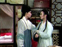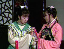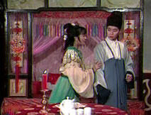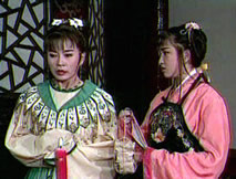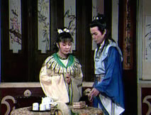 彈完,仲平忙拍手讚賞,放下琵琶,窗外的夜色又在催人早歸了。上前拉起仲平,桂英語含不捨:「相公,好了,你該回去了,不要讓她起疑心。」仲平更加不捨:「我們