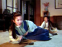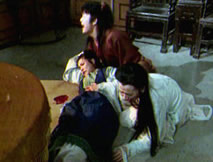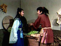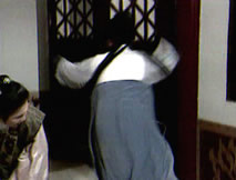大呼一聲:「有賊!」內房中的桂英慌忙奔出,見春香掄了菜刀朝黑衣人猛砍過去。黑衣人力氣不小,幾下閃避就搶過了菜刀,還抓住了春香,將刀鋒橫在
