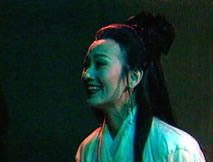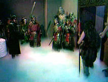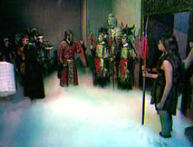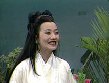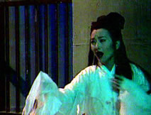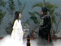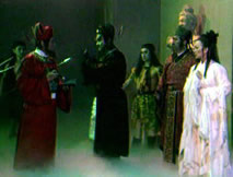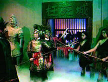 聲:「那本神君只有硬闖了,看降魔劍!」陰光燦燦的降魔劍一出,誰還敢再攔,個個慌忙閃開。鍾馗收劍大步跨進枉死城,城中鬼影幢幢,讓他一時難以辨清,只有揚聲找尋:「桂英,焦桂英,妹子……」角落中獨自端坐的桂英似有耳聞,詫異喃念著:「怎麼好像是大哥的聲音?」站起身來,她尋聲上前。「啊!」眼前身似塔高、面目猙獰的鍾馗嚇得她倒退幾步,心悸不已。「妹